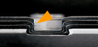 << Bekannte Schwachstelle beim Clinchen. Durch übliche Vibrationen der Anlage sind hier Bruch und/oder Undichtigkeiten vorprogrammiert. Das "obere" Blech ist eine Seite des Rahmenprofils mit einer Stärke von etwa 0,60 mm. An der gekennzeichneten Stelle wahrscheinlich nur noch 0,05 mm. Darüber hinaus bietet die Vertiefung einen idealen Platz für Bakterielle Verunreinigungen. Nach VDI 6022 nicht zulässig. |